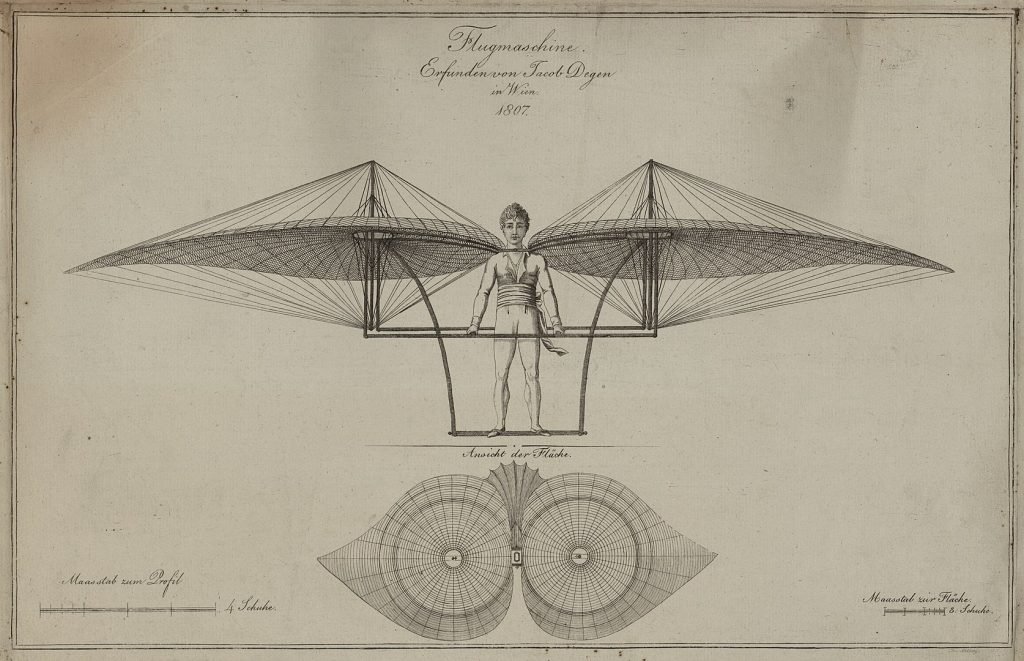«Умелый местный часовщик Деген недавно с большим успехом продемонстрировал в местной школе верховой езды, что с тех пор он значительно усовершенствовал изобретённый им и успешно опробованный в прошлом году аппарат, позволяющий летать по воздуху, как птица, без воздушного шара. К его телу прикреплены 2 искусственных крыла, которые состоят из маленьких кусочков бумаги, соединённых тончайшим шёлком. С помощью взмахов этих крыльев он легко и быстро поднимается от земли по вертикальной и наклонной линии на высоту 54 фута. Это было удивительное зрелище, вызвавшее непроизвольный возглас радости у многих присутствующих, когда этот смелый немецкий мастер поднялся с земли на высоту здания и полетел в разные стороны, то высоко, то низко. При полёте в наклонном направлении ему ещё необходимо специальное устройство — противовес, сила тяги которого составляет всего 40 фунтов, так что, хотя сам он весит 140 фунтов, его крылья всё равно поднимают груз в 100 фунтов. Он ещё не довёл своё искусство до совершенства, которое надеется придать ему в скором времени. Однако уже сейчас он обладает тем большим преимуществом перед всеми аэростатами, что направление полёта полностью зависит от него, если только в открытом воздухе не появляются препятствия». (Константин фон Вурцбах: Деген, Якоб. Биографический словарь Австрийской империи (нем. Biographisches Lexikon des Kaiserthums Oesterreich). Часть 3. Опубликовано в литературно-художественной типографии Anstalt L. C. Zamarski, C. Dittmarsch & Comp., Вена, 1858).