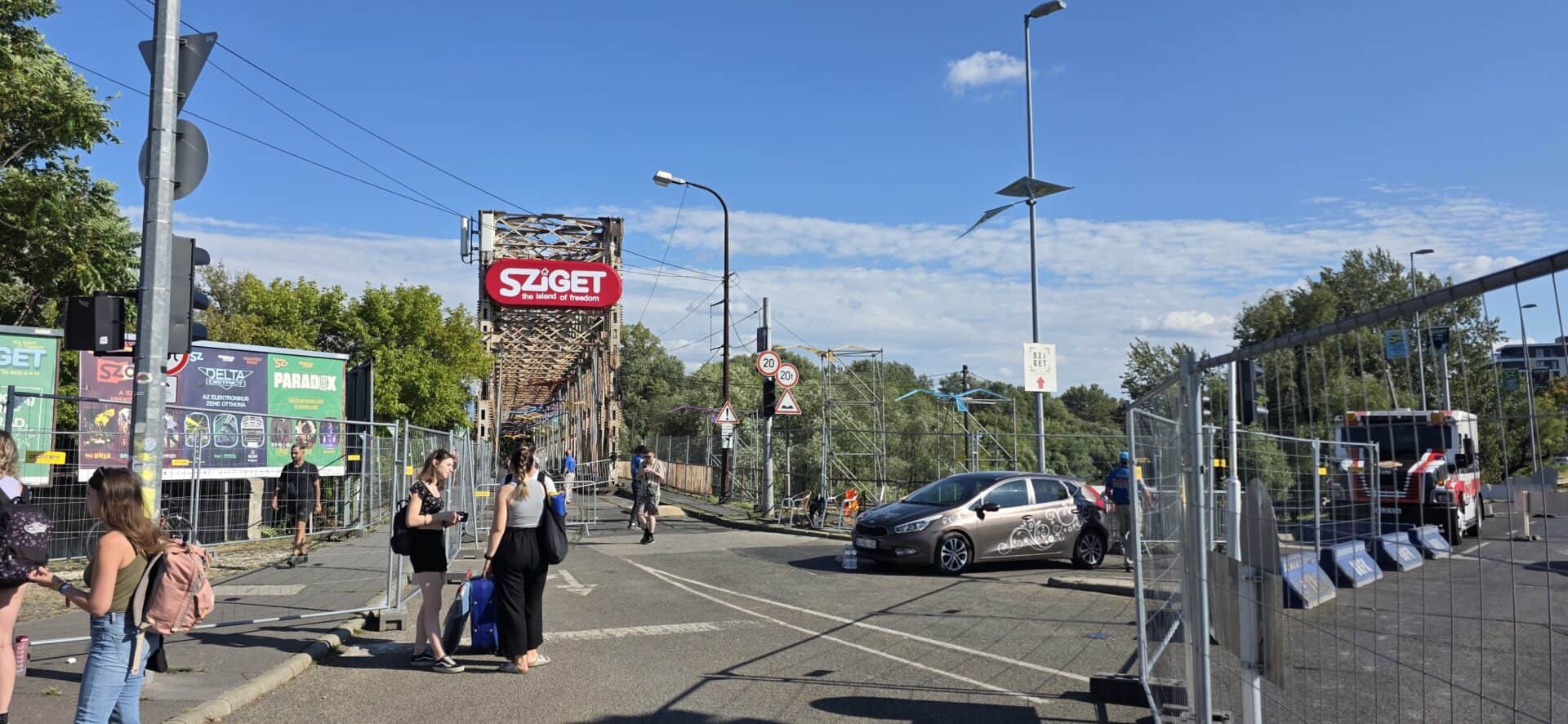 Такси останавливается, мы выходим — и первым делом чувствуем, что мы сделали это! Sziget — остров, расположенный на реке Дунай; воздух здесь живой, летний, тёплый, с прохладной ноткой воды. А следом накрывает другое ощущение — гул счастливых людей, смех, музыка, разговоры, хохот, крики радости. Вокруг идут девушки и парни, мужчины и женщины, встречаются семьи, мелькают дети. Люди тащат тяжёлые сумки, большие рюкзаки, охапки вещей — и улыбаются так, будто эти килограммы только подтверждают: мечта случилась, вход уже рядом. Свежесть жаркого августовского дня обнимает в момент, когда мы ступаем на территорию перед входом на остров, где виден тот самый мост — некий символ этого фестиваля.