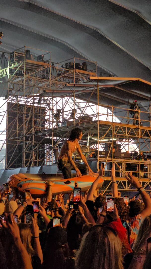 Он прыгал со второго этажа VIP-зоны в надувную лодку, что держали руками зрители. И потом он на этой лодке буквально «ехал» по рукам людей к сцене. Это был сильный опыт. Ты втягиваешься — в атмосферу, в общий поток, в то, как реагируют люди вокруг, и в какой-то момент уже сам ловишь это состояние, когда всё происходит вместе.