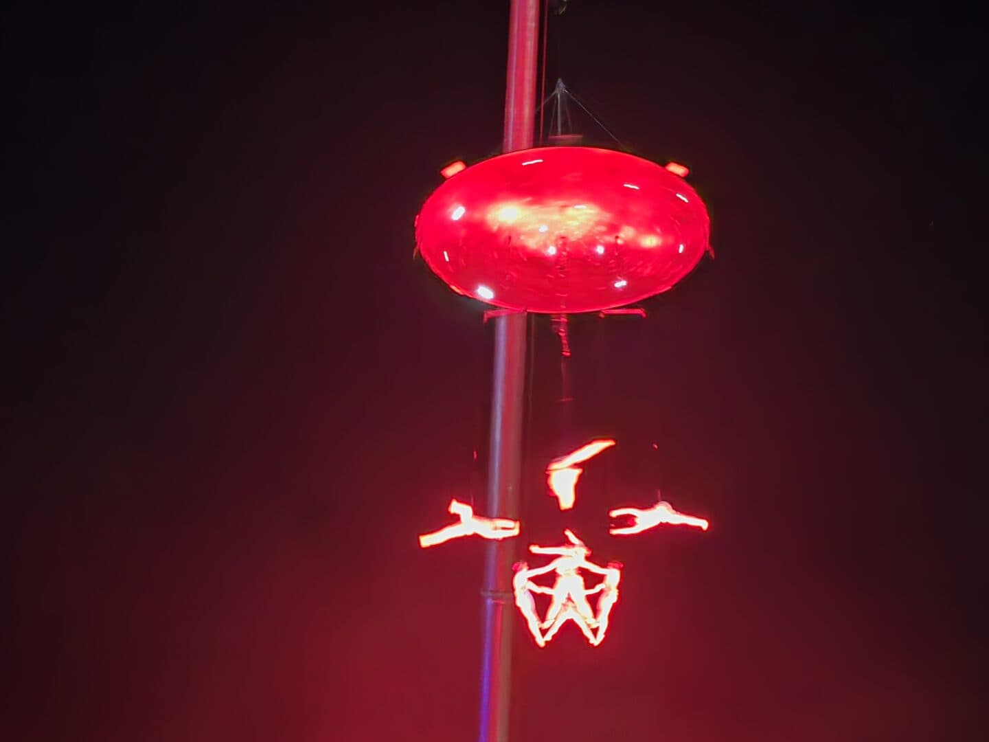 Во-вторых, было невероятно красивое шоу, которое случилось уже ближе к ночи, примерно около 00:00. Выступали акробаты, работавшие на подвешенной высоко в небе сцене. Это сложно описать словами, потому что выглядит необычно. Ты смотришь, как на кране, высоко, в ночном небе несколько человек формируют фигуры, танцуют, делают сложные движения и трюки, при этом они подвешены на тонких практически невидимых тросах и словно парят в воздухе. Это одновременно красиво и немного страшно за них, потому что понимаешь, насколько это сложно.